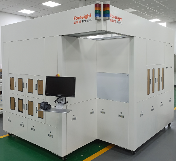 應用于LED半導體外延工藝段,可實現晶圓從原料倉至PVD工序之間以及PVD工序到MOCVD工序之間的周轉。主要由Foup交替上料區、Cassette立體倉儲、機器人取放盤機構、機器人自動上下片組成。
